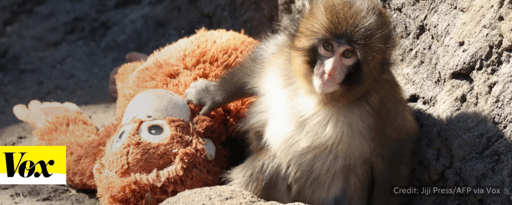“ . . . Japanese macaques – alongside rhesus macaques, baboons, and squirrel monkeys — are among the research animals used for testing drugs and other treatments. Before Punch, there was the researcher Harry Harlow’s infamous monkey lab, where, in a 1950s study of infant-maternal bonding, baby rhesus macaques were traumatically separated from their mothers right after birth and given a surrogate monkey-shaped doll covered in a terry towel. More recently, the National Institutes of Health defunded a set of vision experiments by the Harvard University neuroscientist Margaret Livingtston that involved sewing shut the eyelids of infant monkeys.”